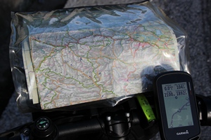 Al snel na mijn pauze gaat de weg langzaam omhoog. Een groep fietsers haalt me één voor één in. Een 61 jarige man -met een fiets met trapondersteuning- spreekt goed Engels en we maken een praatje onder het fietsen. Op een afslag -net onder een paar haarspeldbochten- stopt de groep voor een kleine pauze. Ik stop ook even om te kijken waar ik naar toe moet gaan. Ik moet de kaart op mijn gps ver inzoomen om te zien welke weg ik moet nemen. Ik maak nog een praatje met de Engels sprekende man. Enkele mannen van zijn fietsgroep willen met me op de foto.