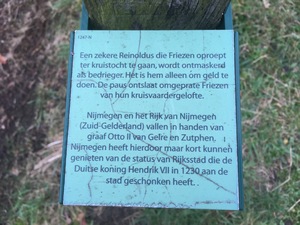 Langs de route staan allemaal paaltjes met een bordje met een jaartal. Aan de paaltjes hangt ook een kubus die je rond kunt draaien. Zo kun je op vier zijden van de kubus een stukje geschiedenis lezen van dat jaar. Zo lezen we dat in 1247 Nijmegen in handen is gevallen van graaf Otto de tweede van Gelre en Zutphen. Nijmegen heeft hierdoor maar kort kunnen genieten van de status als Rijksstad die de Duitse koning Hendrik de zevende aan Nijmegen geschonken had.